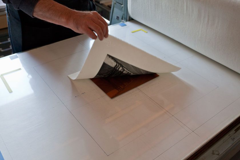 Don inspects his work. Gravure is an amazing process. The way Don uses his film process, the tone is rendered as if with aquatint. There is no discernible mechanical screen and the Epson dither produces a pleasing result.