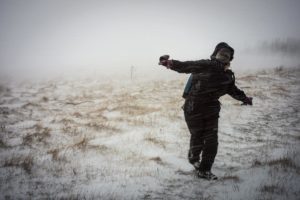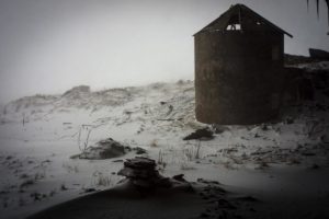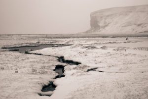 The next morning, an unexpected blizzard arrived. The weather forecasted was light morning snow. The reality was 70-100mph wind driven snow that compacted to form a texture I have never seen in snow in Vermont. For 25 winters, I have encountered many storms in Vermont. But, an Iceland blizzard is most unusual. The moisture from the sea combined with strong driving winds form a snow that is more like cement than snowfall. The wind prevents it from sticking to the unique road surfaces. It just blows past. However, the drifts form over the roads, the winds turn them to ice. We limited our second day to exploring a nearby farmer’s cave, or photographing the landscape in front of the hotel when there was a momentary break in the storm.